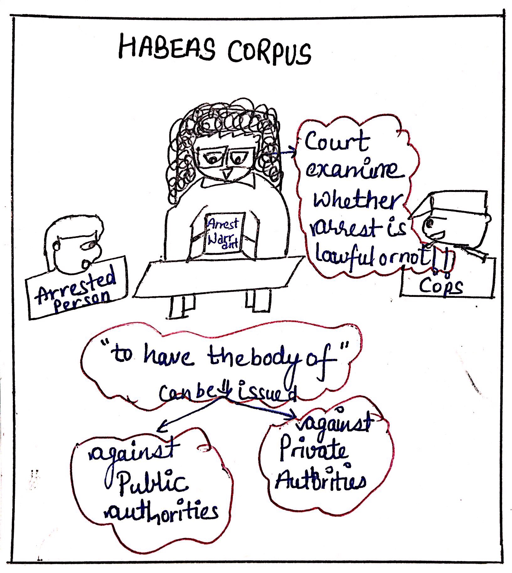A Writ of Habeas Corpus means that the arrested person should be presented before the court so that the court may examine whether the arrest made is lawful or not.
